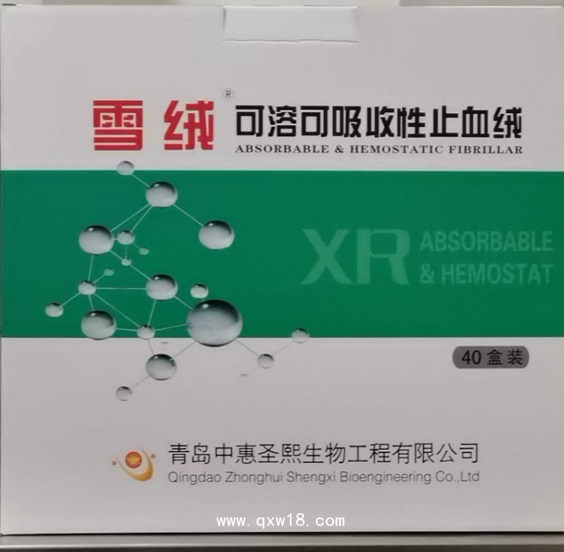 可溶可吸收性止血絨(雪絨)系采用天然粘膠纖維通過(guò)物化反應(yīng)制備而成的一種無(wú)菌可吸收的短纖,其具體材料組成為異性羧甲基醚纖維素鈉。外觀色澤均勻、經(jīng)輻射滅菌,一次性使用。