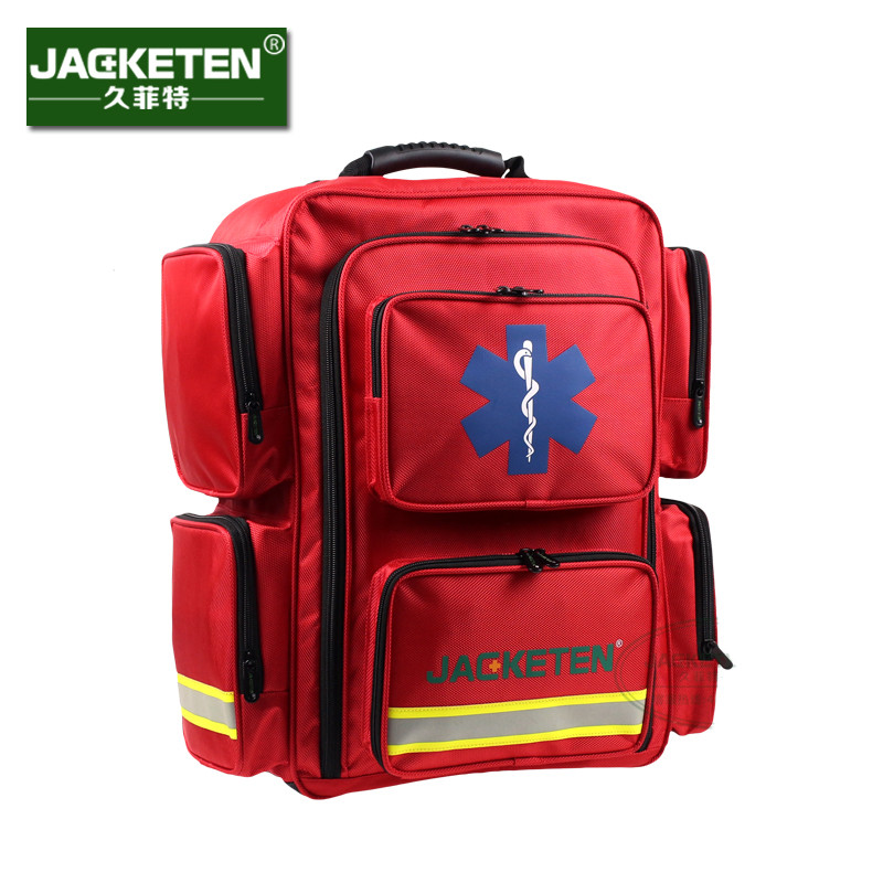 久菲特疾控中心應急包JKT-026采用進口1680D雙股牛津面料,具備防濺水防摔功能,外包著色為紅色,具備雙肩手提兩種攜帶方式,包體內部設計了一個可拆卸的隔層,隔層可以自由組合,有兩條安全綁帶固定兩升的供氧裝置,醫(yī)用儀器等,內置四個透明袋子(魔術貼設計,方便取用和分類醫(yī)療用品);包體共有三組雙向拉鏈,四組單向拉鏈,正面有兩個大口袋,口袋里面有做松緊帶,側面有四個大口袋,用于放置醫(yī)用耗材等,包體底部車有防水防潮墊和腳釘;外部LOGO印有規(guī)范的全球通用《急救之星》標識,久菲特正品LOGO,并織有警示反光條!