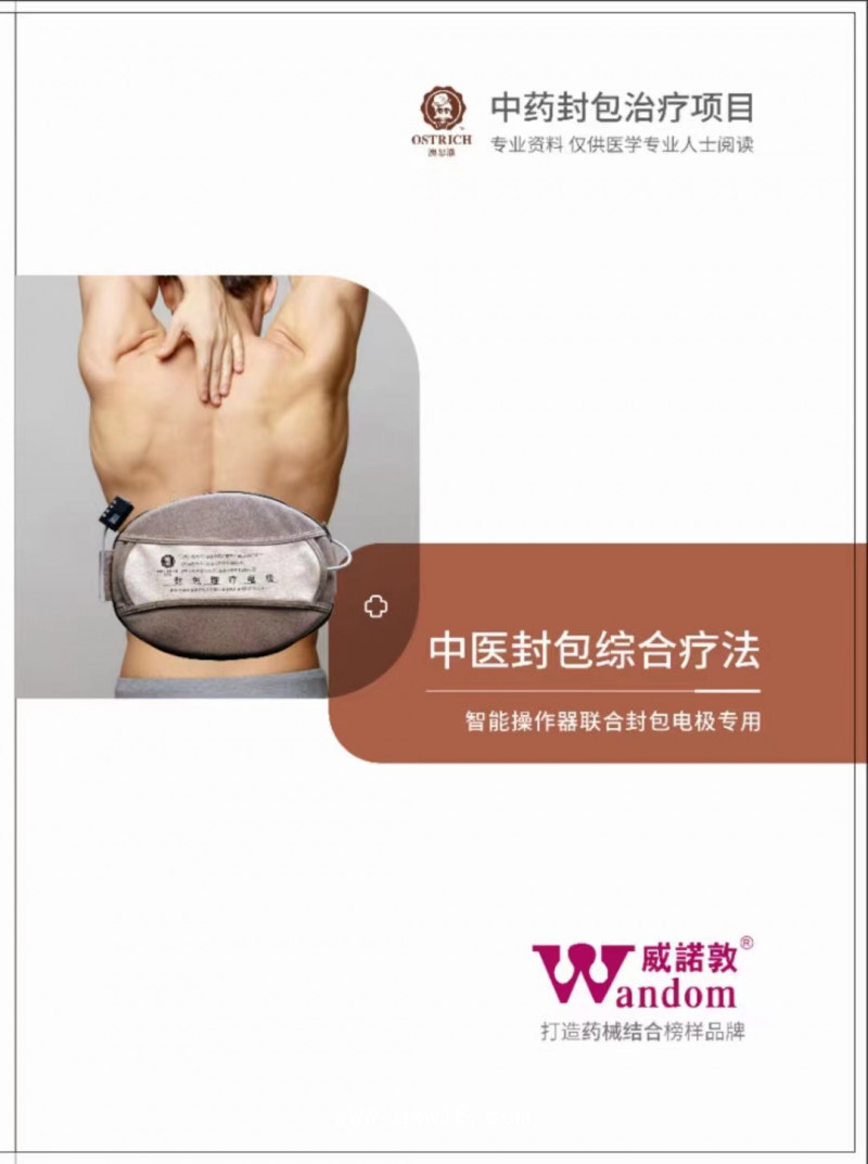 中醫(yī)封包治療是以中醫(yī)外治理論為基礎(chǔ),將現(xiàn)代康復(fù)、亞納米、智能控制等多項(xiàng)技術(shù)相結(jié)合,研制而成的智能新型實(shí)用技術(shù)。它通過熱能的作用,將含有效的活化物質(zhì)的封包敷于人體特定的穴位或病灶,使得遠(yuǎn)紅外熱能、離子活化物等同時(shí)自體表毛竅慢慢地滲透入經(jīng)絡(luò)血脈, 具有調(diào)理氣血、祛風(fēng)散寒、活血通竅、消腫止痛之功,以及強(qiáng)筋骨、補(bǔ)肝腎等作用。
