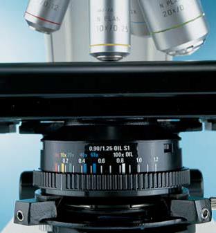 聚光器上的有效光闌刻度有標(biāo)上色標(biāo)的記號。這些記號與物鏡的標(biāo)準(zhǔn)顏色代碼相對應(yīng)。這使得用戶一眼就能找出最匹配當(dāng)前所選擇的物鏡的光闌,同時快速正確的對設(shè)置進(jìn)行設(shè)定