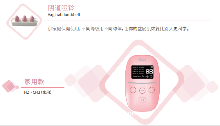 根據(jù)盆底肌修復(fù)、盆底功能障礙性疾?。‵PFD)(盆底功能障礙性疾病主要包括:盆底臟器脫垂(POP)、壓力性尿失禁(SIU)、糞失禁(FI)、性功能障礙(SFD))、產(chǎn)后排尿、產(chǎn)后催乳、產(chǎn)后恢復(fù)等不同的產(chǎn)后問題,特設(shè)置了與其配備的智能模式,產(chǎn)品獲得多項國家專利(包括配套的治療棒)。