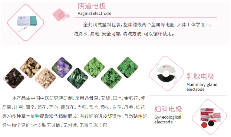 乳腺/婦科電極:本產(chǎn)品由中國中醫(yī)研究院研制,采用透骨草、艾絨、田七、金銀花、伸筋草、川穹、細(xì)辛、菊花、蓮心、藏紅花、當(dāng)歸、蒼術(shù)、桑枝、白芷、丹參、紅花等20多種草本植物提取精華精制而成,有較好的透皮舒適性。且敷貼性好,經(jīng)生物學(xué)評價:對皮膚無過敏、無刺激、無毒。