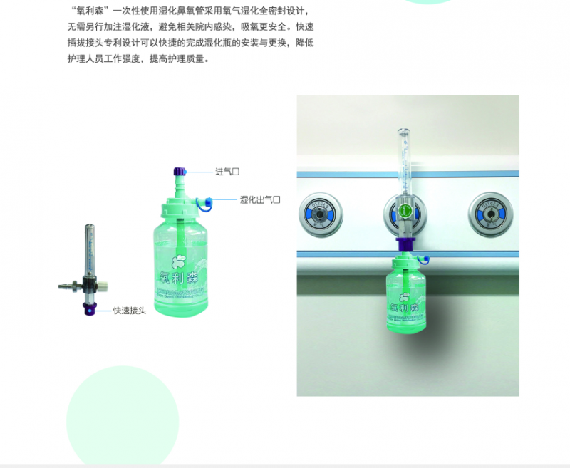 [產(chǎn)品工作原理]一次性使用濕化鼻氧管是通過氧源接頭連接于吸氧濕化瓶,再經(jīng)吸氧濕化瓶連接于氧氣吸入器出氧端,鼻塞放置或固定于吸氧者鼻孔處,當(dāng)開啟氧氣吸入器氧流開關(guān),氧氣經(jīng)濕化瓶濕化后,經(jīng)輸氧管輸入鼻腔。