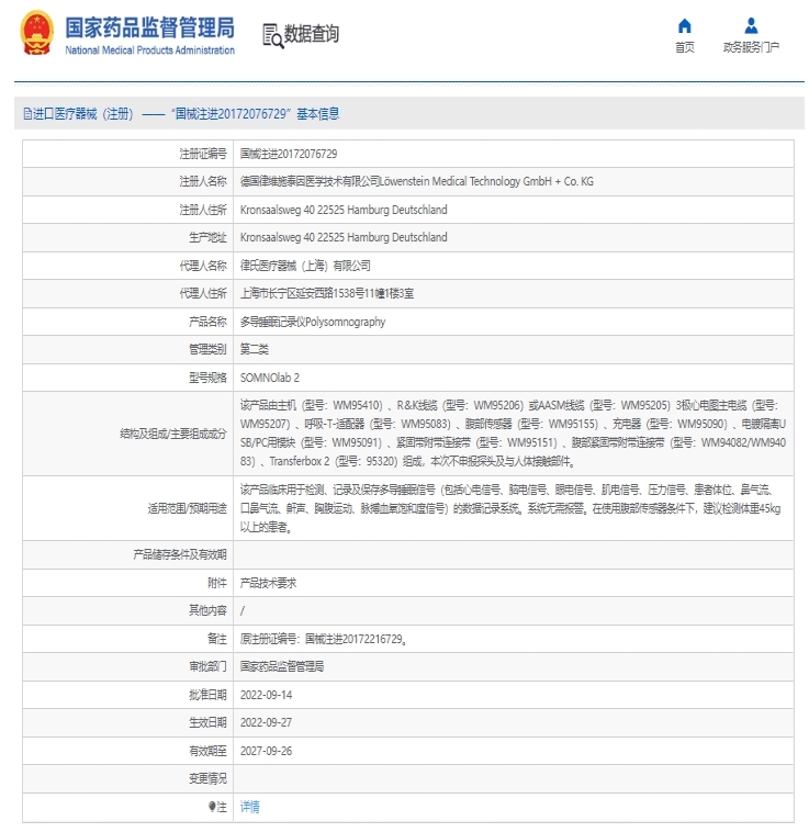 該產(chǎn)品由主機(jī)(型號: WM95410) 、R&K線纜(型號: WM95206) 或AASM纜(型號: WM95205) 3心電圖主電統(tǒng)(型號:WM95207) 、呼吸-T-造配器(型號: WM95083) 、腹部傳感器(型號: WM95155) 、充電器(型號: WM95090) 、電鍍隔離USB/PC用模塊(型號: WM95091) 、緊固帶附帶連接帶(型號: WM95151) 、腹部緊帶附帶連接帶(型號:WM94082/WM94083)Transferbox 2(型號: 95320) 組成,本次不申報(bào)探頭及與人體接觸部件適用范圍/預(yù)期用途