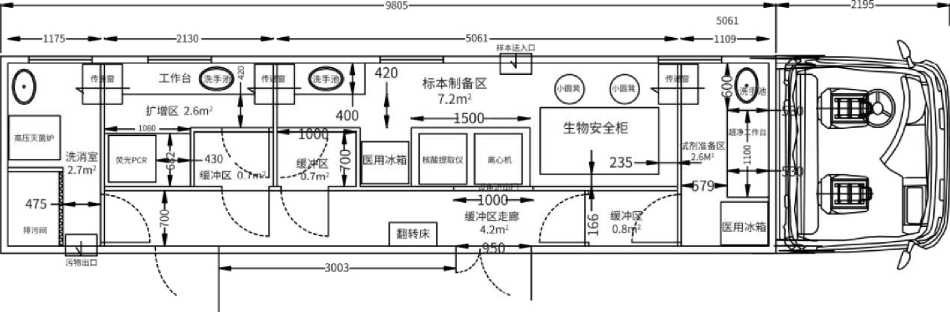 醫(yī)療大巴自動化新冠核酸檢測醫(yī)療室基于加強型二級生物安全實驗室要求設(shè)計,設(shè)有試劑準(zhǔn)備區(qū)、標(biāo)本制備區(qū)、擴增區(qū)三個主要功能區(qū),同時配套進、出更衣室及高壓消殺設(shè)備。人員單向流動,各醫(yī)療區(qū)之間采用傳遞窗及緩沖間隔離,防止氣溶膠污染。醫(yī)療室整體負壓,核心醫(yī)療室區(qū)超過12次/小時的換風(fēng)效果,確保醫(yī)療人員操作安全。