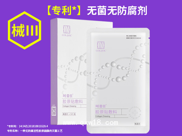 使用方法:清潔患處皮膚,取膠原貼敷料敷患處,將袋內(nèi)膠原蛋白原液擠出后均勻涂抹于敷料表面,每天使用1次,每次20±5分鐘,連續(xù)使用1周,然后每周使用2~3次,兩周為一個(gè)療程。