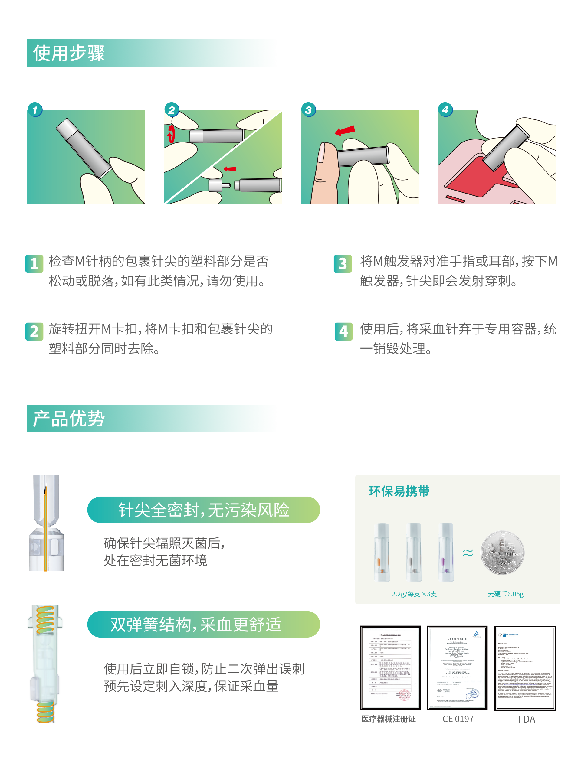 暢銳一次性使用末梢采血針(安全鎖卡式M型)產(chǎn)品說明:
