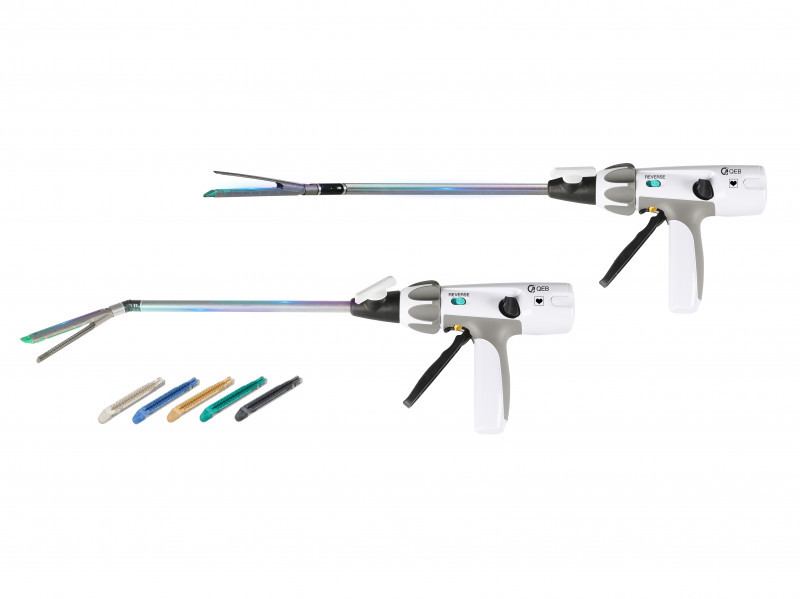 一次性腔鏡用直線型電動(dòng)切割吻合器(以下簡稱吻合器)根據(jù)結(jié)構(gòu)和外形分為QEA、QEB、 QEC三種型號(hào)。QEA型吻合器由抵釘座、釘倉座、套管、旋轉(zhuǎn)手柄、倒轉(zhuǎn)開關(guān)、手動(dòng)復(fù)位蓋、復(fù)位手柄、電池包、固定手柄、閉合手柄、保險(xiǎn)開關(guān)、擊發(fā)手柄和切割刀組成。QEB、QEC 型吻合器由抵釘座、釘倉座、套管、旋轉(zhuǎn)手柄、倒轉(zhuǎn)開關(guān)、手動(dòng)復(fù)位蓋、復(fù)位手柄、電池包、固定手柄、閉合手柄、保險(xiǎn)開關(guān)、擊發(fā)手柄、彎轉(zhuǎn)手柄和切割刀組成。EFA 型和EFB型組件由釘倉、釘倉蓋板、吻合釘組成。吻合器和組件各自獨(dú)立包裝滅菌出廠。該產(chǎn)品以無菌狀態(tài)提供,經(jīng)輻照滅菌。一次性使用。