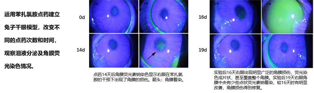 運(yùn)用苯扎氯胺點(diǎn)藥建立兔子干眼模型,改變不同的點(diǎn)藥次數(shù)和時(shí)間,觀察淚液分泌及角膜熒光染色情況。