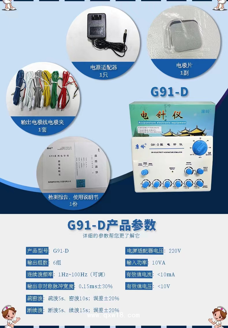 G91系列電針儀是將低頻電子脈沖技術(shù)和我國(guó)傳統(tǒng)的針灸經(jīng)絡(luò)學(xué)說(shuō)相結(jié)合的電子理療儀器。它采用人體的穴位針灸,通過(guò)脈沖電流取代人工捻轉(zhuǎn),具有散風(fēng)寒、解痙摩、疏通經(jīng)絡(luò)、舒筋活血等功能。本儀器對(duì)關(guān)節(jié)痛、腰痛、心絞痛、坐骨神經(jīng)痛、面部神經(jīng)麻痹、中風(fēng)、肩周炎、關(guān)節(jié)炎、神經(jīng)性耳鳴、支氣管哮喘等常見(jiàn)病、多發(fā)病均有較好的療效。