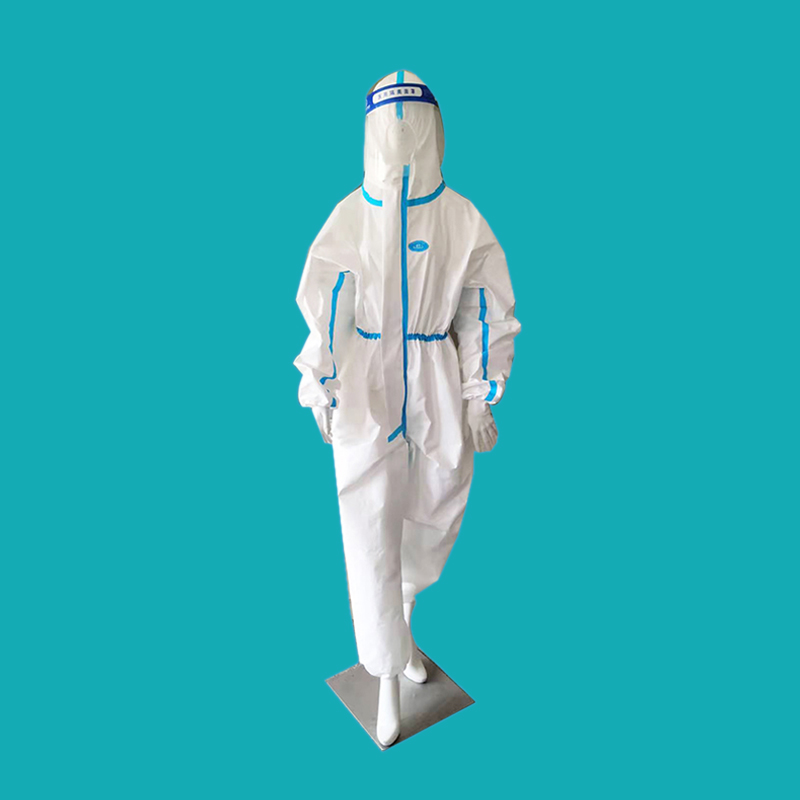 【結(jié)構(gòu)及組成】:本產(chǎn)品由復(fù)聚乙烯膜的聚丙烯無紡布加工制成。由連帽上衣、褲子組成。