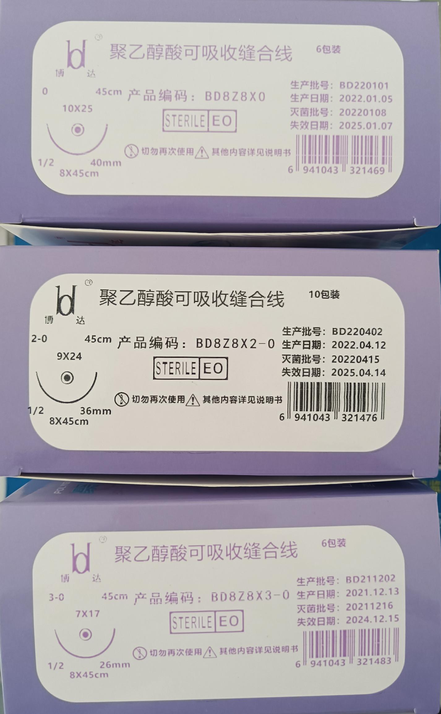該產(chǎn)品是由聚乙醇酸縫合線和醫(yī)用縫合針連接而成。縫合線以聚乙醇為原料,結(jié)構(gòu)為多股編織,涂層采用硬脂酸鈣,縫合線染色以D&C紫羅蘭2#作染料。縫合針采用3Cr13不銹鋼絲加工制成。一次性使用產(chǎn)品,環(huán)氧乙烷滅菌。