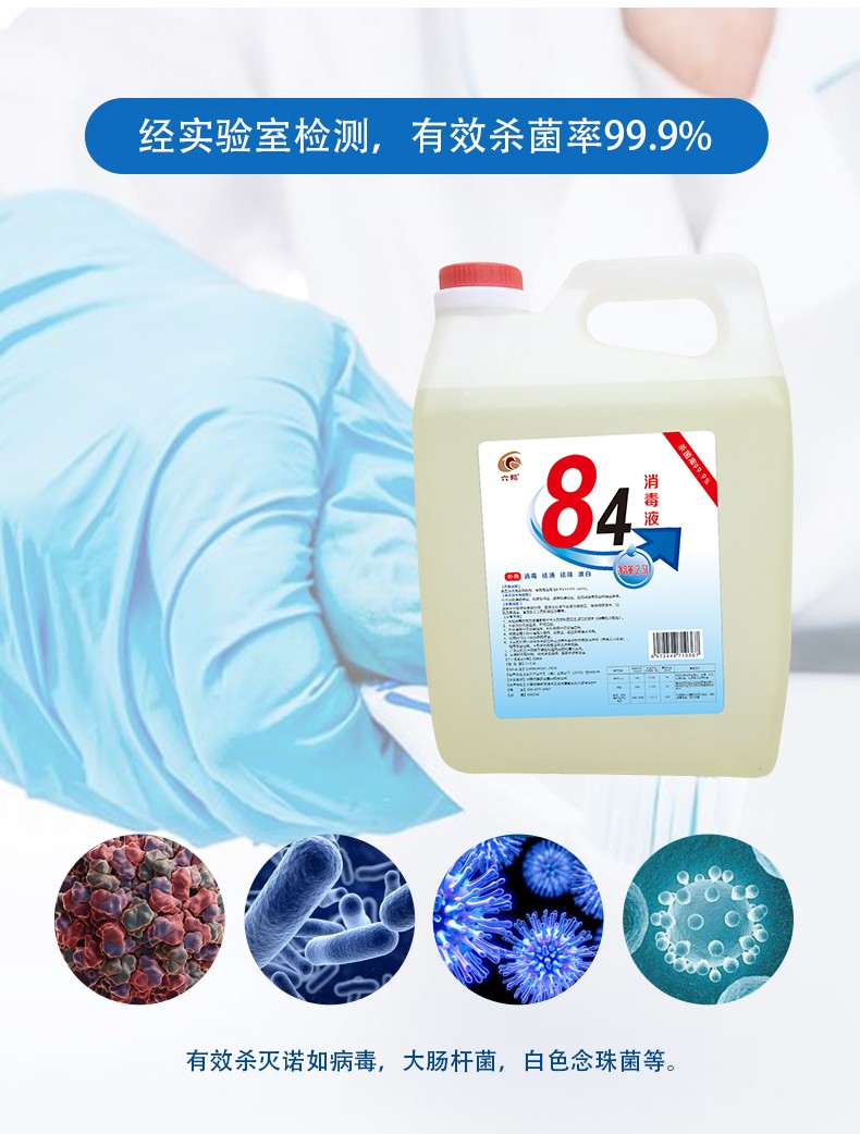 現(xiàn)貨84消毒液2.5L次氯酸鈉醫(yī)院酒店室內(nèi)衛(wèi)生間防疫產(chǎn)品說明: