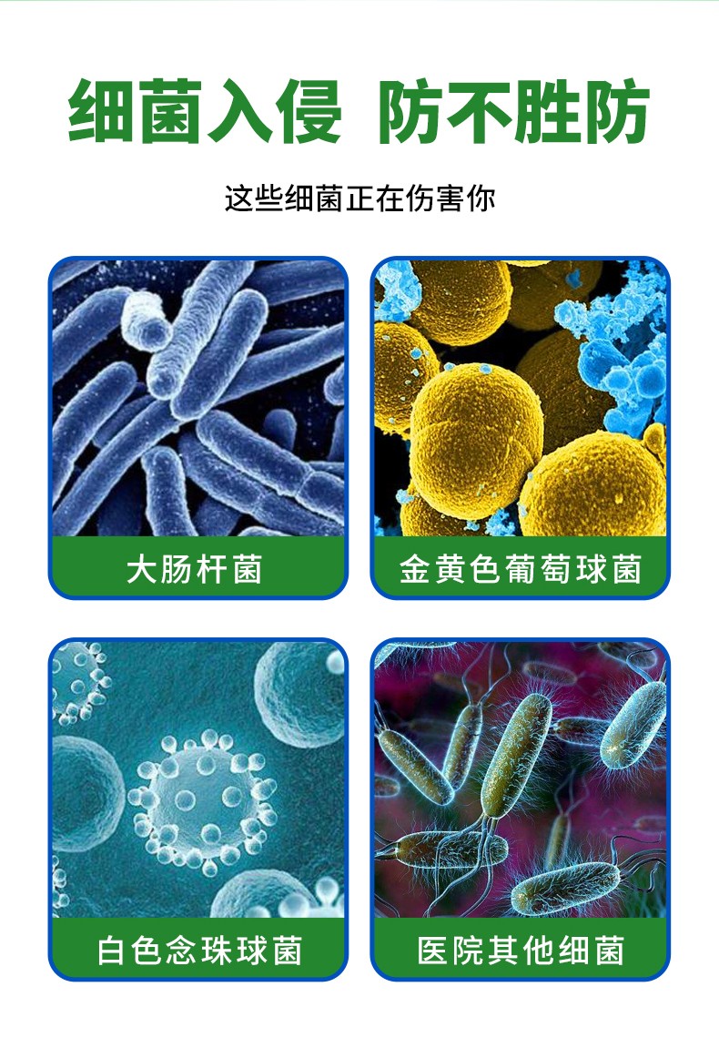 消滅類別細(xì)菌繁殖體、大腸桿菌,金黃色葡萄糖菌、白色念珠菌。