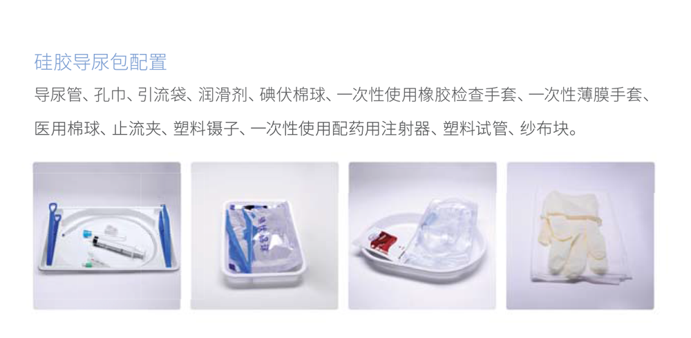 主要配件:導(dǎo)尿管、一次性醫(yī)用孔巾、一次性使用引流袋、潤(rùn)滑劑、醫(yī)用碘伏棉球(包)、一次性使用橡膠檢查手套、塑料鑷子、止流夾、一次性使用配藥用注射器、塑料試管、醫(yī)用棉球、醫(yī)用脫脂紗布?jí)K、一次性使用薄膜手套