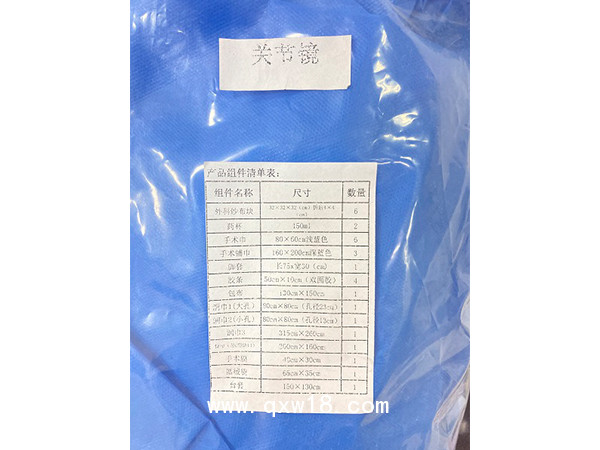 本產(chǎn)品由一-次性使用無菌手術(shù)膜、包布、洞巾、臺會、手術(shù)鋪巾、手術(shù)巾、醫(yī)用彈力繃帶(四肢)、儀器套、擦手紙、醫(yī)用外科敷料、夾子托盤、彎盤、鹽水碗、量碗、藥杯等組成,各手術(shù)包根據(jù)需要選擇不同的配件(有醫(yī)院收費(fèi)目錄)