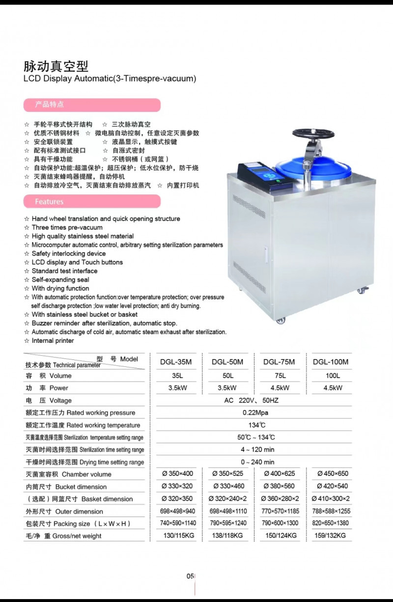產(chǎn)品用途:本立式滅菌器是一種安全可靠并自動(dòng)程序控制的滅菌設(shè)備,外形為方形立式結(jié)構(gòu),主要由外殼、滅菌室、蒸汽發(fā)生器、管道系統(tǒng)和控制系統(tǒng)等組成。具有造型新穎美觀(guān)、操作方便、使用安全、節(jié)能、功能、加熱迅速、滅菌效果可靠等優(yōu)點(diǎn)。該產(chǎn)品各是醫(yī)療衛(wèi)生、大專(zhuān)院校實(shí)驗(yàn)室、臨床機(jī)構(gòu)、生物科研、食品化工等單位對(duì)醫(yī)療器械、敷料、玻璃器皿、溶液培養(yǎng)基等進(jìn)行消毒滅菌的理想設(shè)備。產(chǎn)品特點(diǎn):手輪平移式快開(kāi)結(jié)構(gòu)