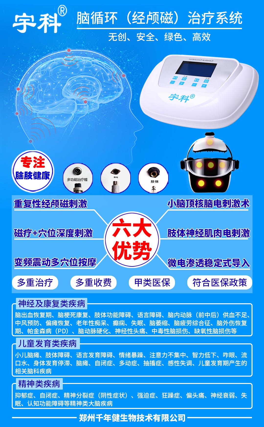 鄭州千年健生物技術(shù)有限公司是一家專(zhuān)注于智能醫(yī)療器械研發(fā)、生產(chǎn)、銷(xiāo)售、貼牌、售后、服務(wù)于一體的高新現(xiàn)代化集團(tuán)企業(yè)。生產(chǎn):理療電極片(定向透藥電極),理療用體表電極,?醫(yī)用超聲耦合貼片,穴位壓力刺激貼、盆底肌肉康復(fù)器,沖洗器,醫(yī)用壓敏膠帶(醫(yī)用復(fù)合膠布,三伏貼),軀干固定器,醫(yī)用冰墊,上肢固定器,醫(yī)用隔離面罩,肢體壓力套,下肢固定器;超聲腦血管治療儀、腦循環(huán)功能障礙治療儀、超聲脈沖電導(dǎo)治療儀、中醫(yī)定向透藥治療儀、胃腸動(dòng)力治療、經(jīng)顱磁治療儀,超聲電導(dǎo)透藥儀,多功能電針治療儀,電腦中頻治療儀、隔物灸治療儀、中風(fēng)偏癱治療系統(tǒng)、中醫(yī)定向透化系統(tǒng)、中頻溫?zé)嶂委焹x、中藥離子導(dǎo)入治療儀、智能眼部按摩儀,明目視力眼貼、熱敷蒸汽眼罩等;公司自成立之日起始終秉承“品質(zhì)第一、信譽(yù)第一、客戶(hù)至上”的原則;本著“依托科技創(chuàng)新,滿(mǎn)足客戶(hù)醫(yī)療需求,以人才為基礎(chǔ),謀求發(fā)展;以質(zhì)量為生命,體現(xiàn)價(jià)值;以信譽(yù)為根本,立足百年”的理念;