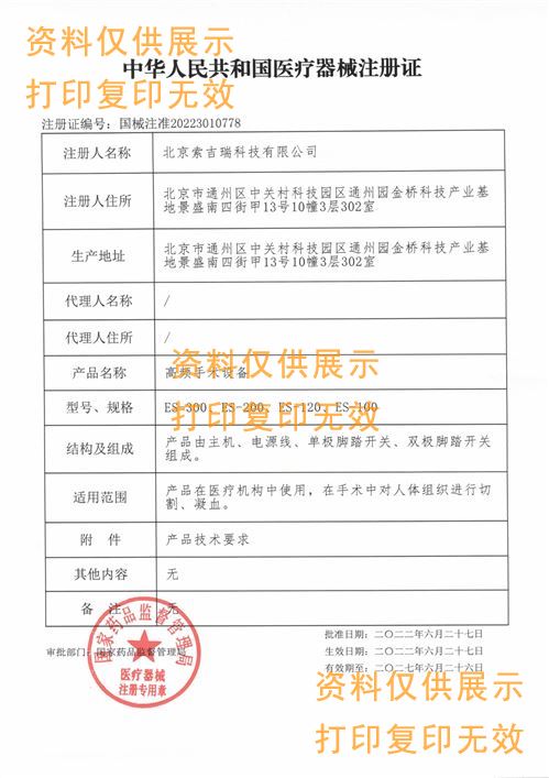 高頻手術設備主機對應注冊證號:國械注準20223010778