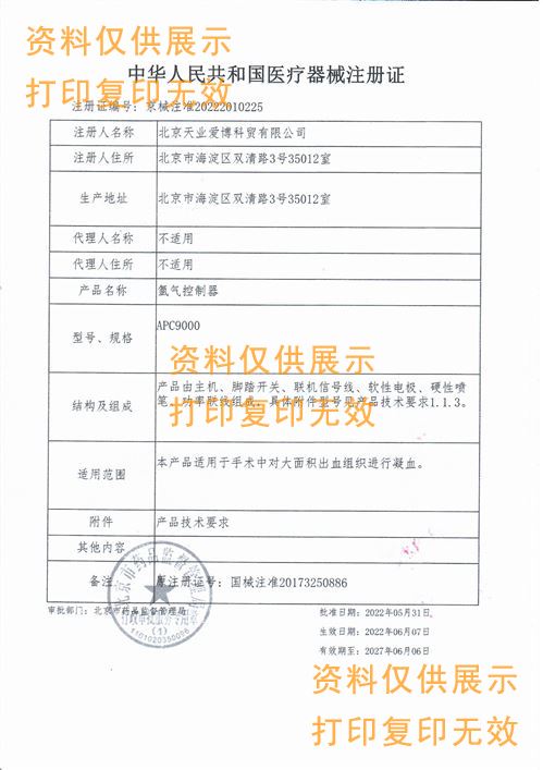 氬氣控制器對應注冊證號:京械注準20222010225