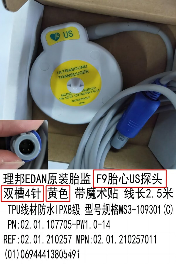 理邦EDAN原裝胎監(jiān) F9胎心US探頭? 雙槽4針 黃色 帶魔術貼 線長2.5米 TPU線材防水IPX8級 型號規(guī)格MS3-109301(C) PN:02.01.107705-PW1.0-14 REF:02.01.210257 MPN:02.01.210257011 (01)06944413805491? 適用機型F9/F9E