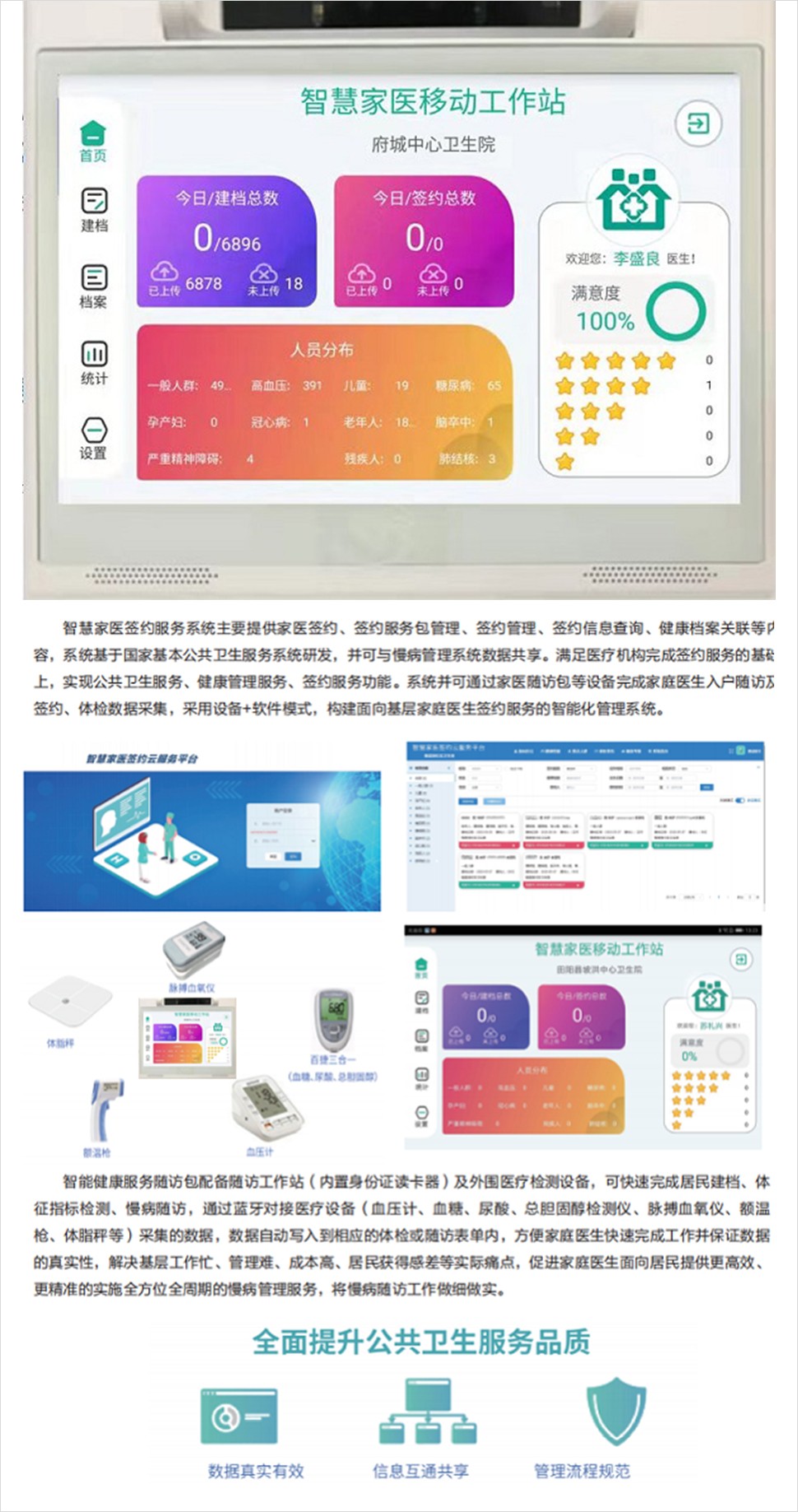 智慧家庭醫(yī)生簽約服務(wù)系統(tǒng)系統(tǒng)可通過(guò)家醫(yī)隨訪包等設(shè)備完成家庭醫(yī)生入戶隨訪及簽約、體檢數(shù)據(jù)采集,采用設(shè)備+軟件模式,構(gòu)建面向基層家庭醫(yī)生簽約服務(wù)的智能化管理系統(tǒng)。