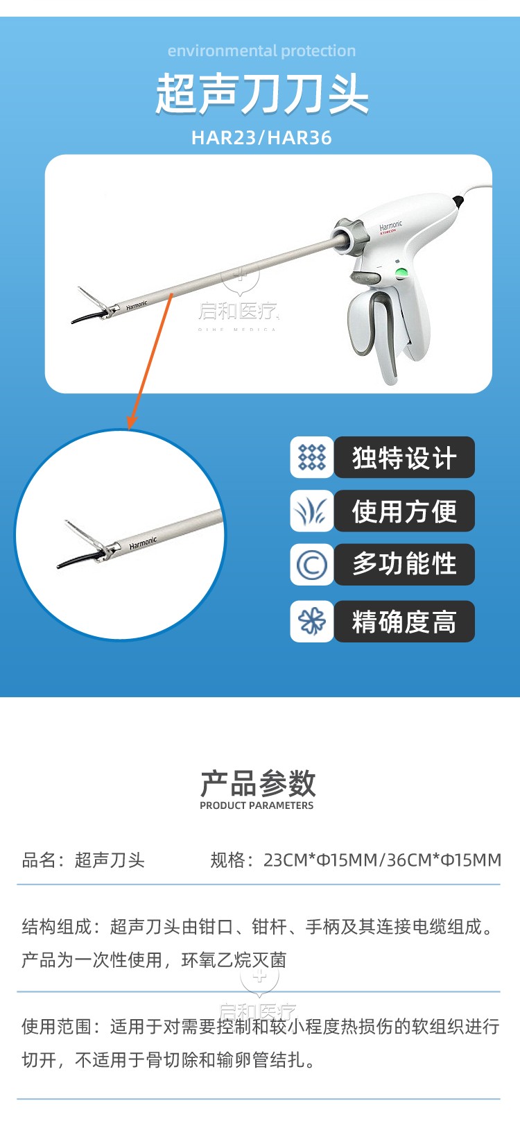 適用范圍:超聲刀頭與GEN11超聲高頻外科集成系統(tǒng)主機(jī)配合,在開放式和內(nèi)窺鏡手術(shù)中使用,適用于軟組織切口時(shí)按所需控制出血及將熱損傷最小化。可閉合直徑最大5毫米(含5毫米)的血管。