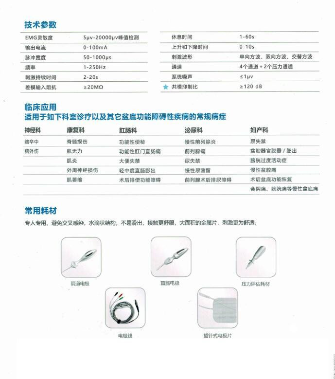 主要用于盆底障礙疾病、產(chǎn)后康復(fù)以及腦卒中、顱腦損傷、脊髓損傷、小兒腦癱、外周神經(jīng)損傷、痙攣狀態(tài)、遲緩性癱瘓、廢用性肌萎縮、疼痛綜合征、關(guān)節(jié)活動(dòng)受限、假肢功能訓(xùn)練、神經(jīng)功能性障礙(如緊張癥等)臨床問題