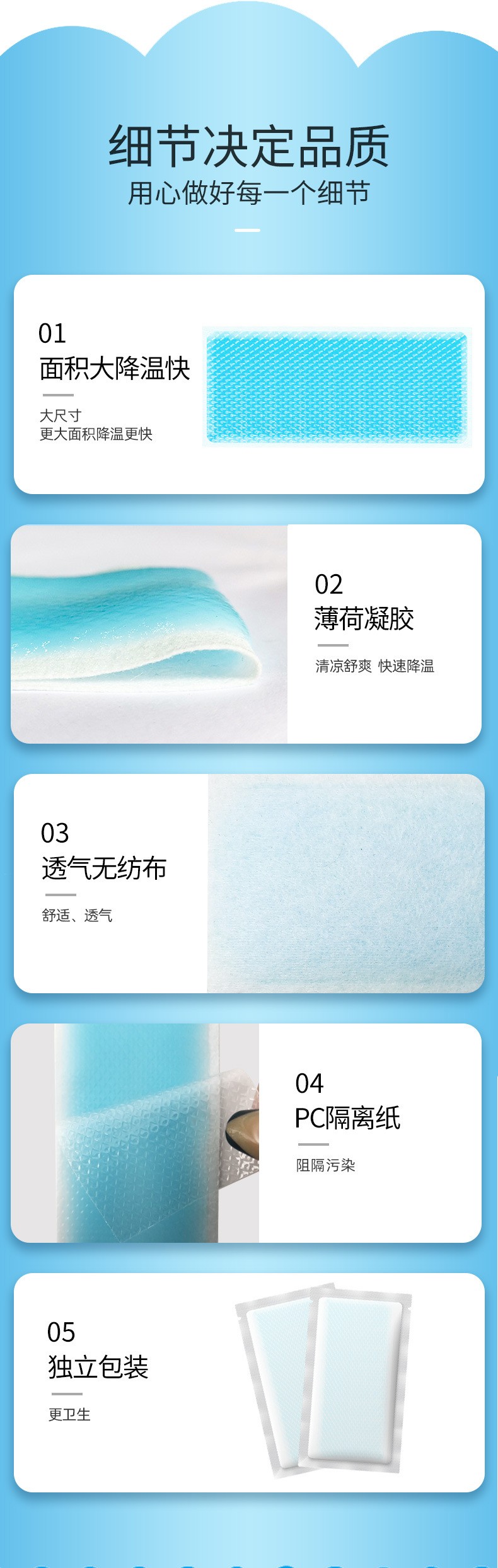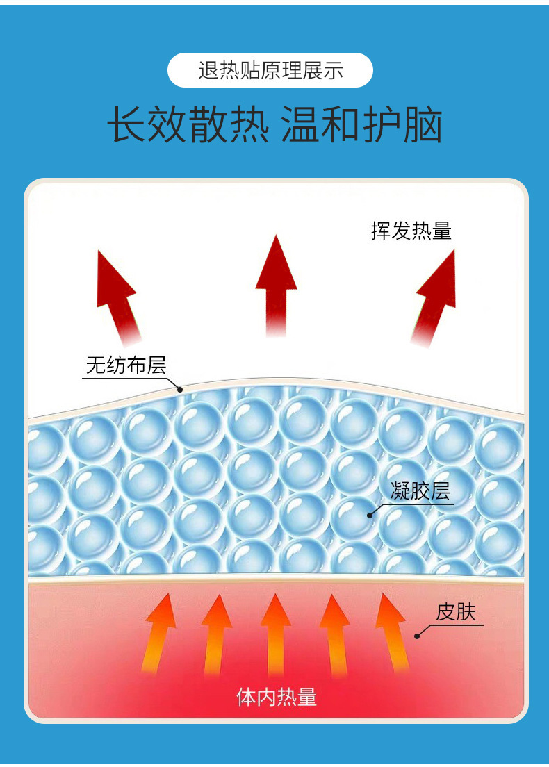 高分子透明凝膠:通過敏感肌膚測(cè)試,溫和不刺激;親膚凝膠,粘性好不脫膠:親膚凝膠層,散熱更快、更持久;舒適柔軟:大面積彈力布:可根據(jù)實(shí)際需要適當(dāng)剪裁厚再使用;獨(dú)立包裝,鎖住有效成分;氣味溫和不刺激:抗過敏材料,不會(huì)對(duì)眼睛產(chǎn)生刺激,呵護(hù)寶寶肌膚,進(jìn)口高分子凝膠基劑,輕松剝離不留膠。