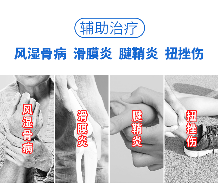 【適用范圍】本產(chǎn)品促進(jìn)局部血液循環(huán)、輔助消炎、消腫和止痛。適用于肩周炎、關(guān)節(jié)炎、頸椎病、腰椎間盤(pán)突出、腰肌勞損、骨質(zhì)增生、滑膜炎、腱鞘炎、扭挫傷等引起不適癥狀的輔助治療。