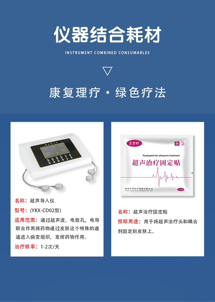 導(dǎo)入療法:超聲導(dǎo)入儀是通過(guò)超聲波,電致孔,電導(dǎo)聯(lián)合作用將藥物通過(guò)皮膚這個(gè)特殊的通道進(jìn)入病變組織,發(fā)揮藥物作用,利用配套耗材來(lái)完成藥物經(jīng)肌膚直接到病灶部位,靶位給藥。區(qū)別于口服、肌注、靜脈滴注等給藥方法,屬于第三代的給藥模式。