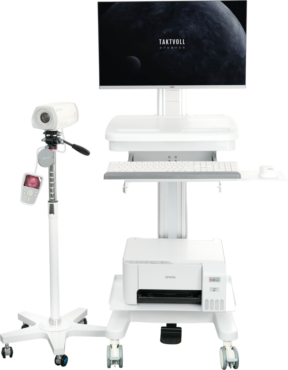 結(jié)構(gòu)與組成:電子陰道顯微鏡是由電子攝像機(jī)、光源、計(jì)算機(jī)主機(jī)、顯示器及外設(shè)、圖像處理軟件、采集卡、電源適配器、臺(tái)車、支架組成。