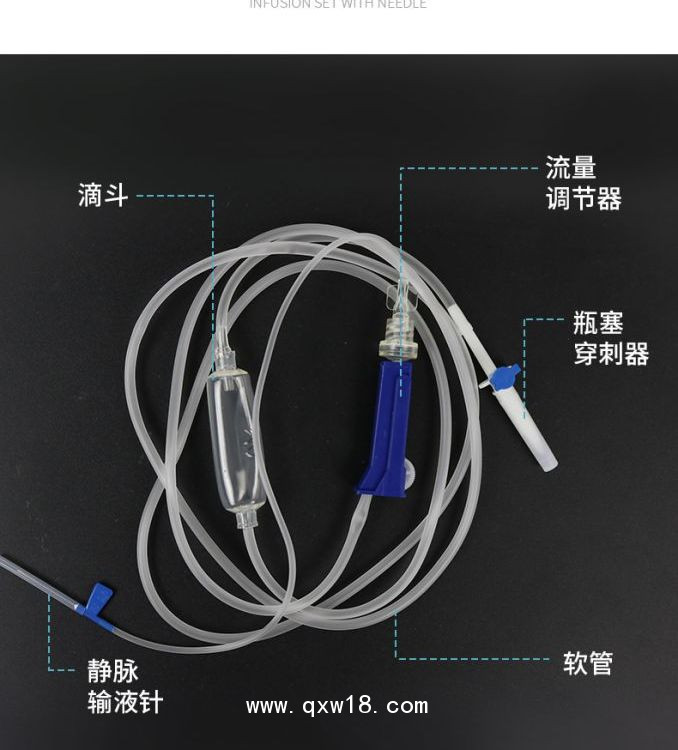 一般由靜脈針或注射針、針頭護帽、輸液軟管、藥液過濾器、流速調(diào)節(jié)器、滴壺、瓶塞穿刺器、空氣過濾器等八個部分連接組成,部分輸液器還有注射件,加藥口等。