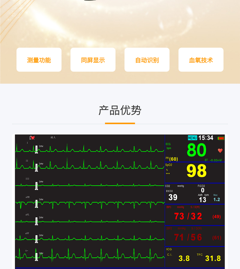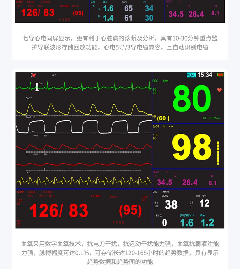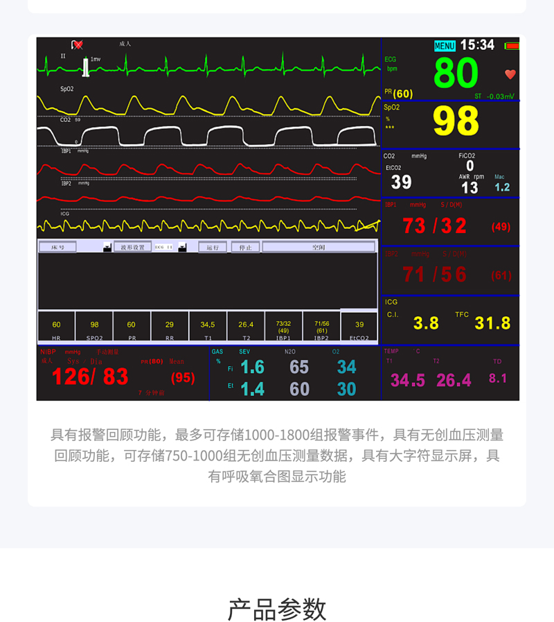 監(jiān)測功能:?標配心電、呼吸、血氧飽和度、無創(chuàng)血壓、脈搏、雙通道體溫監(jiān)測