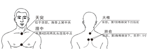 【用法用量】1、貼于肺俞穴和大椎穴,先用溫毛巾擦洗穴位周圍皮膚。拆封后慢慢將保護(hù)層揭下,將其貼于穴位之上,癥狀較重患者可加貼天突穴、膻中穴,或遵醫(yī)囑。(見穴位示意圖)
