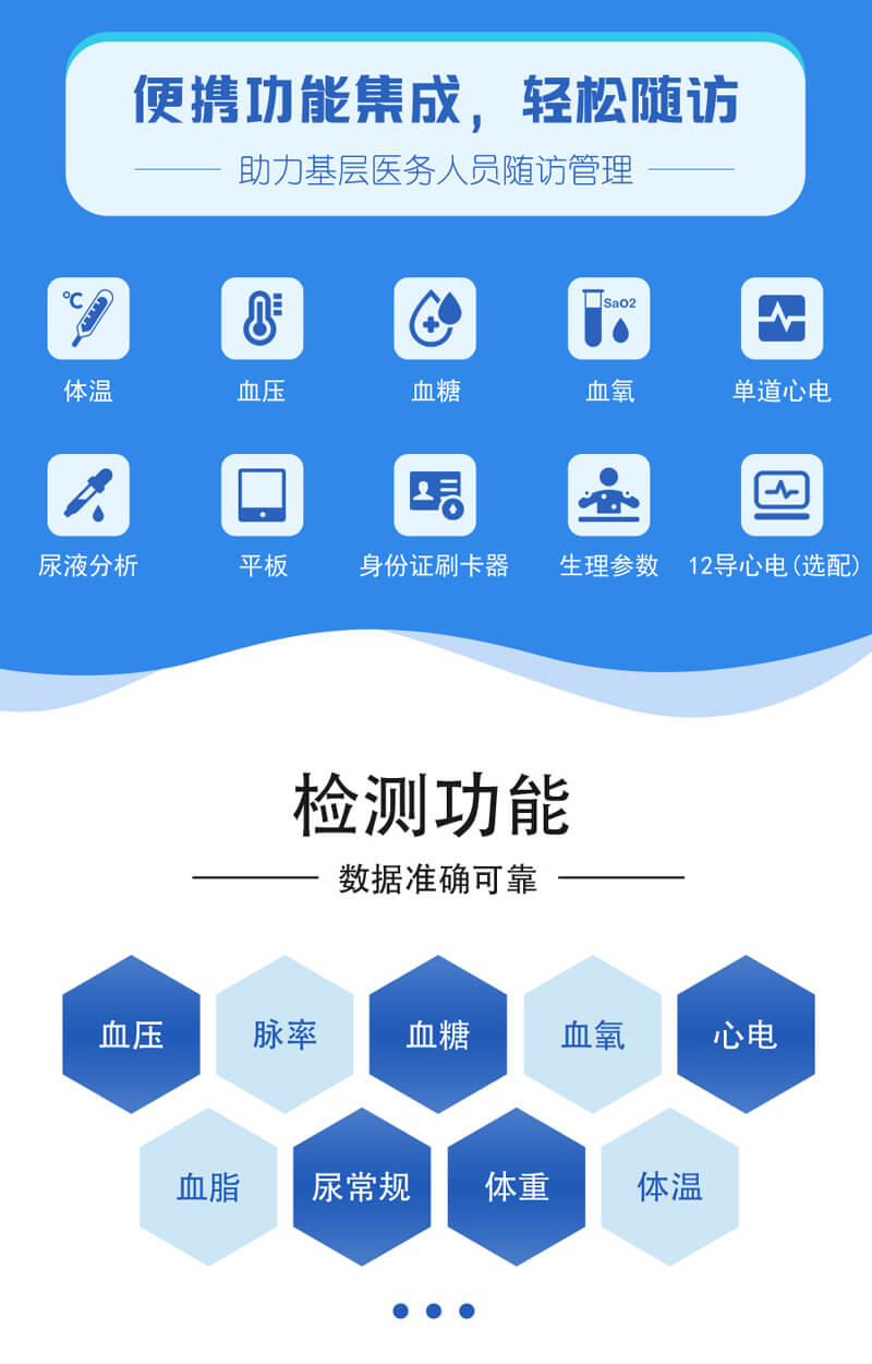 其次,上正華瑞公共衛(wèi)生服務(wù)隨訪包內(nèi)集成了多種檢測工具,如血壓計(jì)、血糖儀等,可以迅速而準(zhǔn)確地完成多項(xiàng)基礎(chǔ)健康數(shù)據(jù)的快速檢測及收集。這不僅提高了隨訪工作的效率,也確保了數(shù)據(jù)的準(zhǔn)確性,為慢病管理提供了可靠依據(jù)。