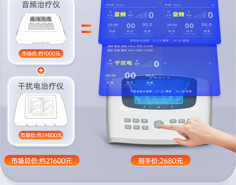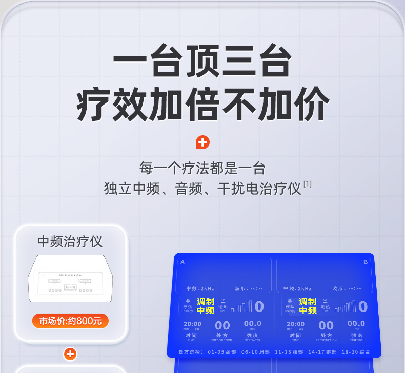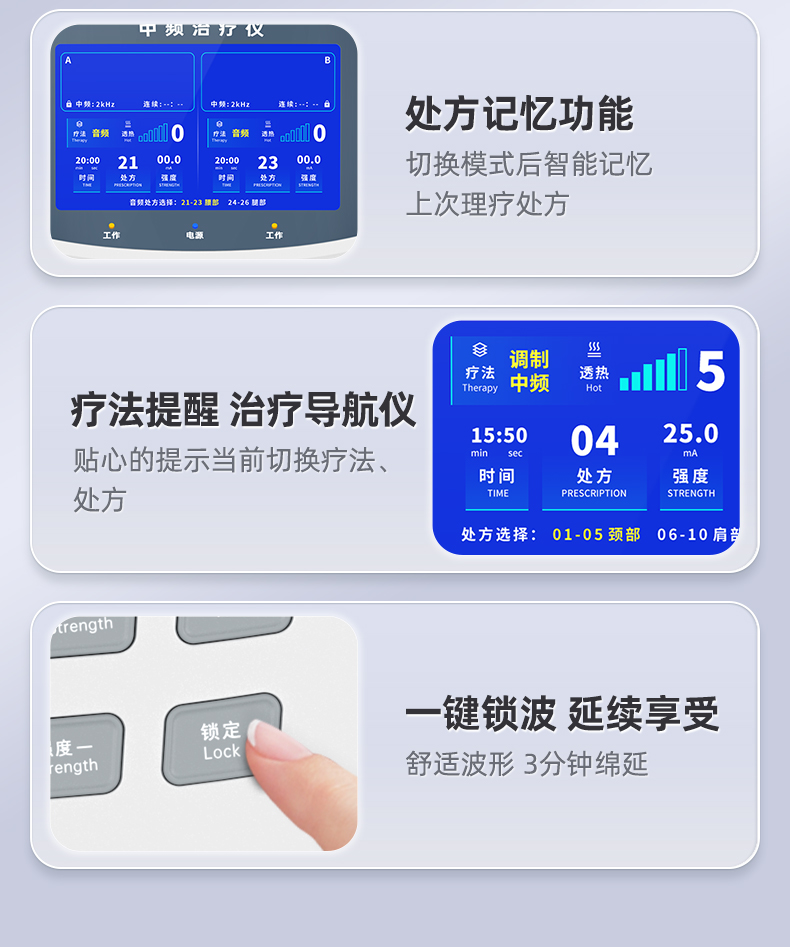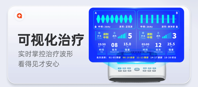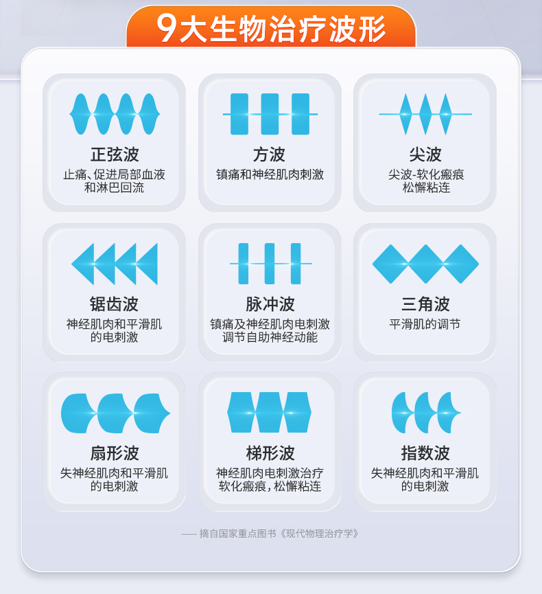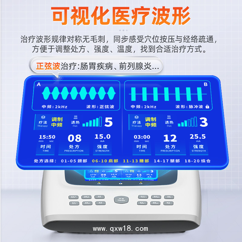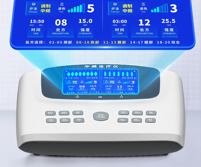 中頻治療儀,醫(yī)用三大療法 9種波型電熱雙道通中頻治療儀產(chǎn)品說明: