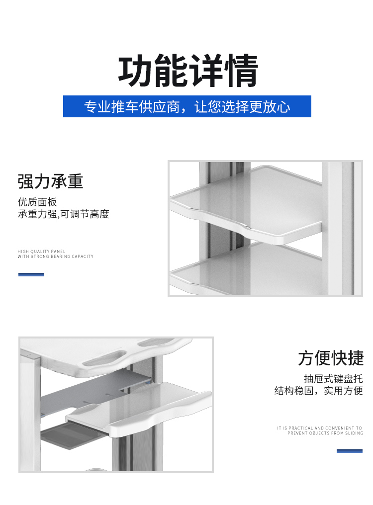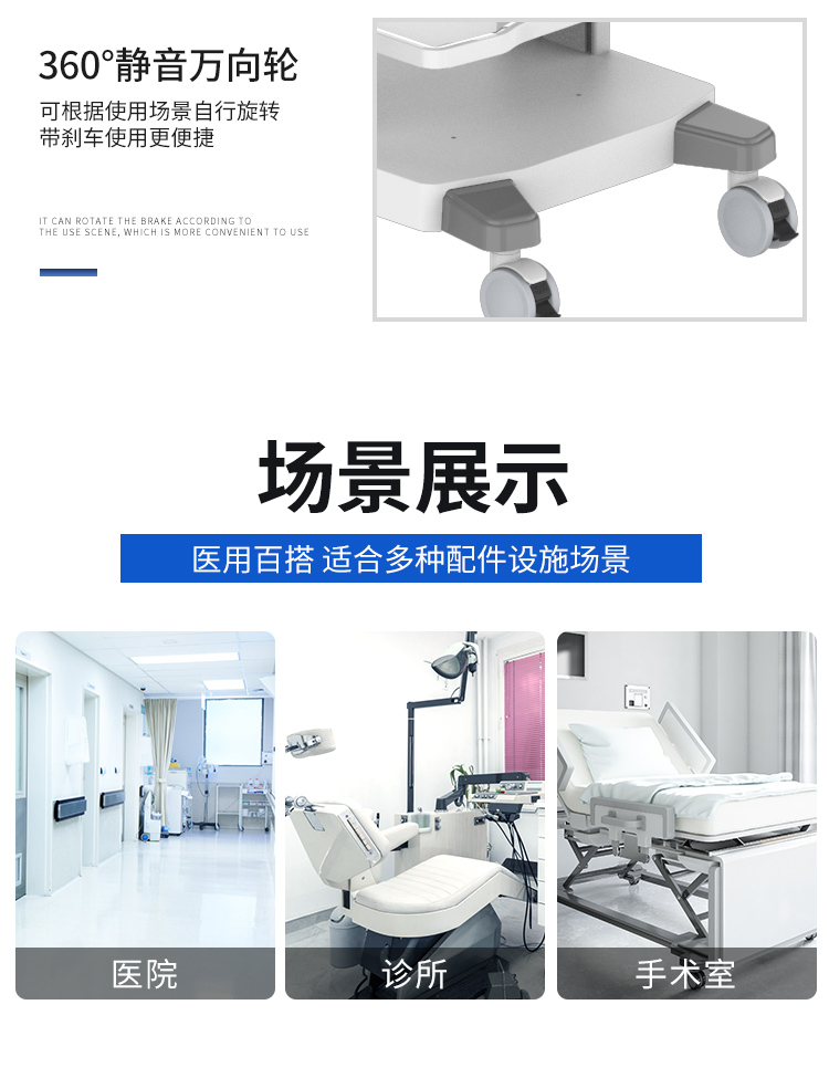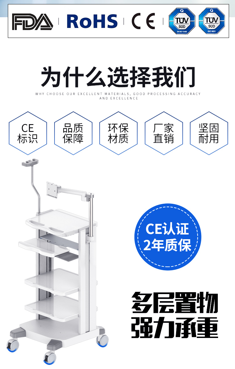 此款內(nèi)窺鏡設(shè)備推車是我公司自主研發(fā)的多功能置物推車可適用于腹腔鏡設(shè)備,宮腔鏡設(shè)備,胃腸鏡設(shè)備,耳鼻喉鏡設(shè)備,氣管鏡設(shè)備,關(guān)節(jié)鏡設(shè)備,泌尿設(shè)備,動物內(nèi)窺鏡設(shè)備,醫(yī)美設(shè)備,手術(shù)室設(shè)備等,通用性強(qiáng)。全車模塊化設(shè)計,可隨意增減配置,自行調(diào)節(jié)層高,更適合人體功能學(xué)所需。可根據(jù)不同的軟、硬管鏡加裝不同的掛架和配件,也可個性化定制,讓醫(yī)護(hù)人員提高效率得心應(yīng)手的同時也很好的節(jié)省了醫(yī)院空間。推車采用高強(qiáng)度鋁合金和冷制鋼板加工而成,純金屬材質(zhì)穩(wěn)定性更好,觸感質(zhì)感更強(qiáng)且堅固耐用。所有金屬表面均經(jīng)過特殊打磨處理及噴塑,抗菌、防滑、耐腐、易清潔。搭載靜音萬向醫(yī)用腳輪并配有制動裝置,靈活推拉,輕松鎖定。推車可整裝運(yùn)輸也可散裝運(yùn)輸,安裝簡單配有組裝說明,配有螺絲和工具,品質(zhì)有保障。