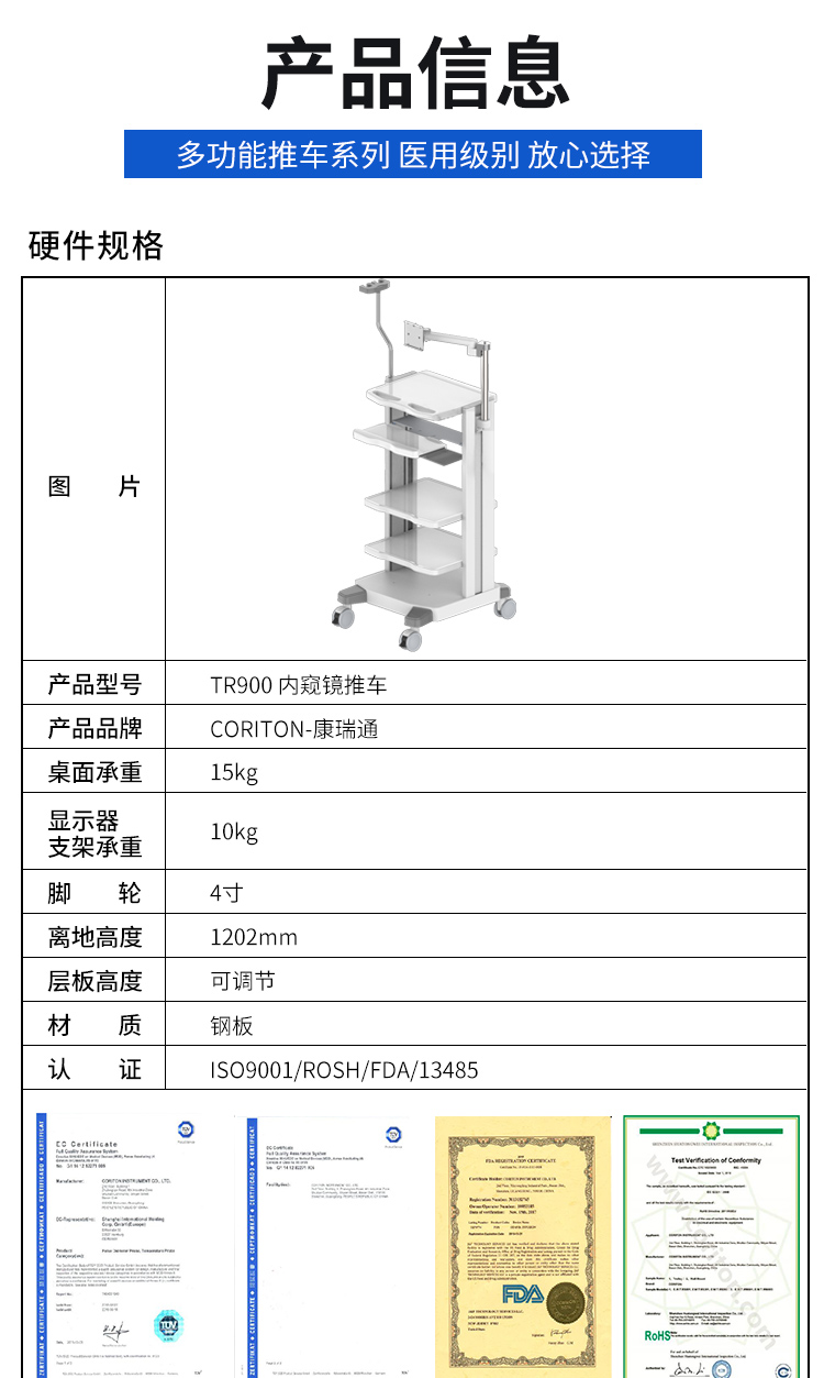 TR900內(nèi)窺鏡醫(yī)療推車設(shè)備推車耳鼻喉鏡設(shè)備臺車產(chǎn)品說明: