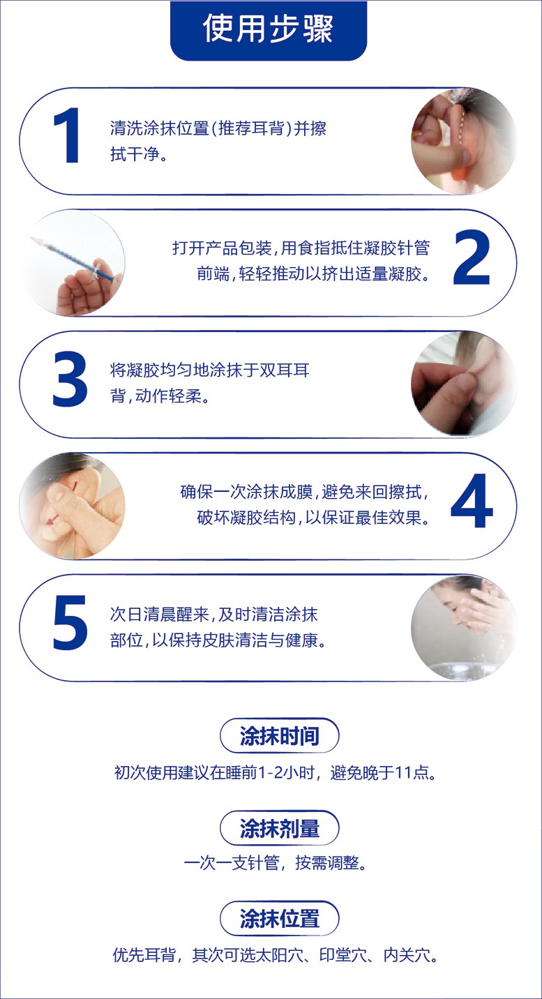 [使用方法]外用,每晚睡前提前一個小時涂于耳背,也可涂于太陽穴、內(nèi)關(guān)穴或印堂穴。每日一次,每次至少涂抹一個穴位,每次約0.1g。