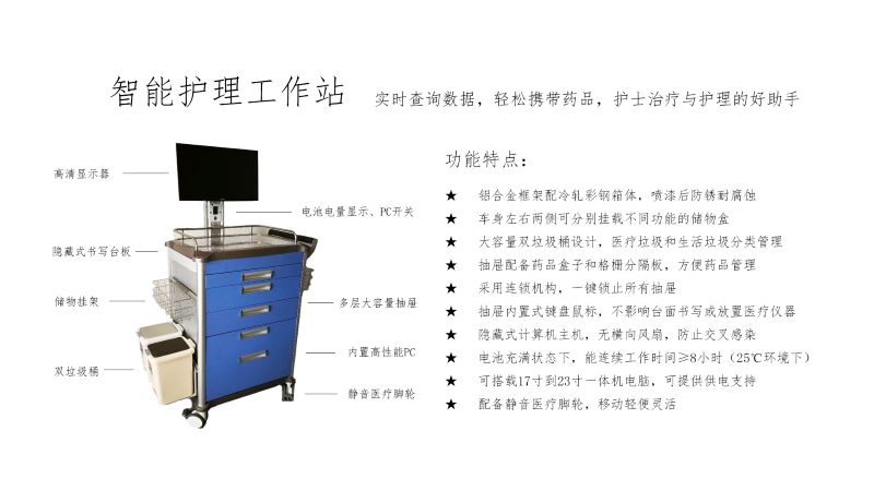 該設(shè)備設(shè)計符合人體工程學原理、外形美觀、推動靈活,是醫(yī)生和護士查房時的好助手。將給醫(yī)院的醫(yī)療水平插上無線的翅膀,加快醫(yī)院信息化、數(shù)字化進程,醫(yī)院的醫(yī)療管理將上一個新的臺階。