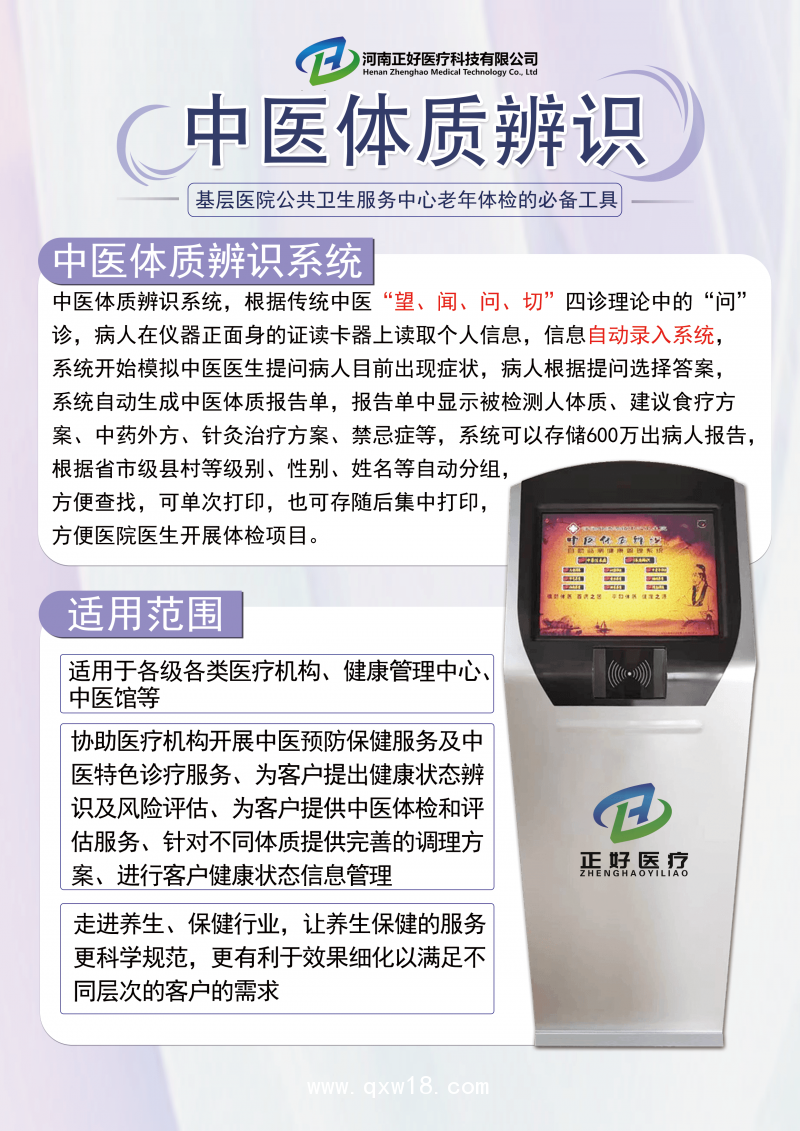 中醫(yī)體質(zhì)辨識系統(tǒng),根據(jù)傳統(tǒng)中醫(yī)“望、聞、問、切”四診理論中的“問診,病人在儀器正面身的證讀卡器上讀取個人信息,信息自動錄入系統(tǒng)系統(tǒng)開始模擬中醫(yī)醫(yī)生提問病人目前出現(xiàn)癥狀,病人根據(jù)提問選擇答案系統(tǒng)自動生成中醫(yī)體質(zhì)報告單,報告單中顯示被檢測人體質(zhì)、建議食療方案、中藥外方、針灸治療方案、禁忌癥等,系統(tǒng)可以存儲600萬出病人報告根據(jù)省市級縣村等級別、性別、姓名等自動分組,方便查找,可單次打印,也可存隨后集中打印,方便醫(yī)院醫(yī)生開展體檢項目。