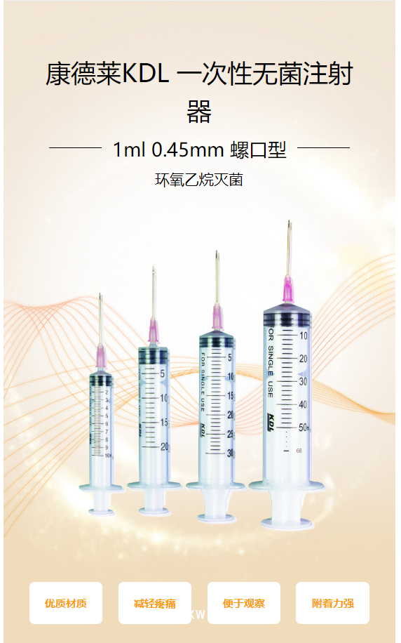 康德萊KDL 一次性無(wú)菌注射器 1ml 0.45mm 螺口型(100支/盒 30盒/件 )產(chǎn)品說明: