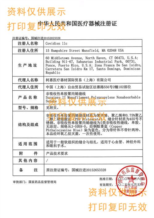 ? ? ?非吸收性單股聚丙烯縫線材質(zhì)為聚丙烯、聚乙烯和0.75%聚乙二醇二硬脂酸鹽(PEG Distearate)。縫合針材質(zhì)為455號(hào)不銹鋼。非吸收性單股聚丙烯縫線為I類非吸收性縫線,單股、無涂層、規(guī)格從3-0到8-0。經(jīng)銅酞菁藍(lán)(Copper Phthalocyanine Blue)染為藍(lán)色。分為帶針和不帶針兩種。本品經(jīng)環(huán)氧乙烷滅菌,一次性使用。