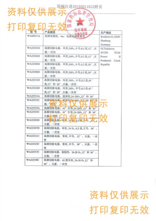 適用范圍:該產(chǎn)品與內(nèi)窺鏡和高頻電刀配套使用,經(jīng)尿道或?qū)m頸在生理鹽水中對(duì)前列腺或?qū)m腔進(jìn)行凝固、切割和等離子汽化操作。(WA22558C僅用于前列腺治療)。