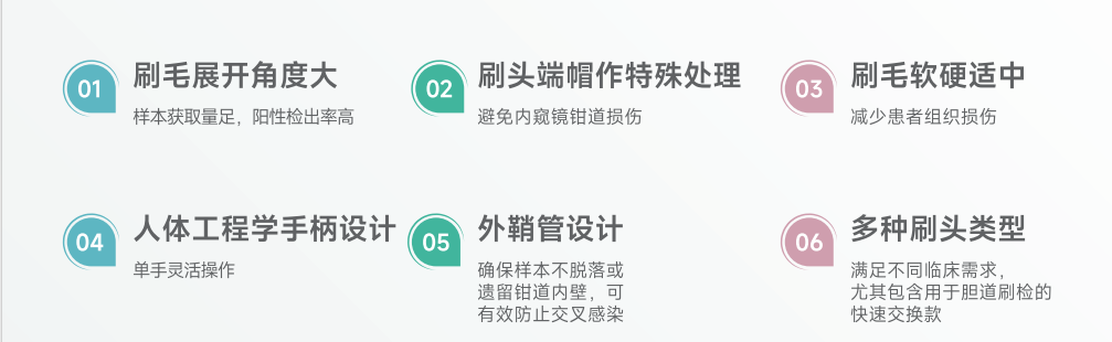 刷毛展開角度大;2.多種刷頭類型;3.人體工學(xué)手柄;4.刷毛軟硬適中;5.外鞘管設(shè)計(jì)