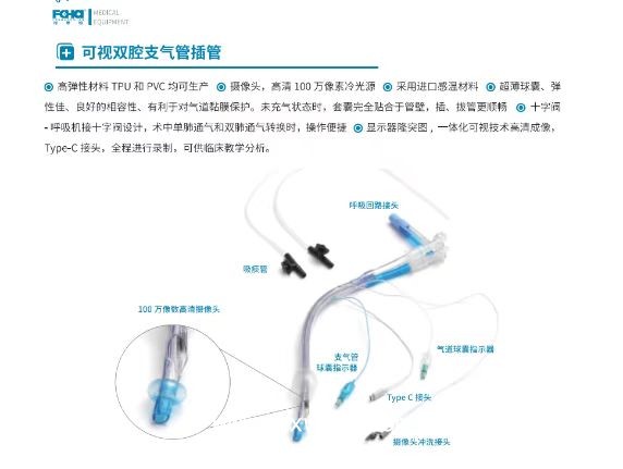 ?高弾性材料 TPU 和 PVC 均可生產(chǎn) ◎ 攝像頭,高清 100 萬像素冷光源 ◎ 采用進(jìn)口感溫材料 ◎ 超薄球囊、彈性佳、良好的相容性、有利于對(duì)氣道黏膜保護(hù)。未充氣狀態(tài)時(shí),套囊完全貼合于管壁,插、拔管更順暢 ◎ 十字閥呼吸機(jī)接十字閥設(shè)計(jì),術(shù)中單肺通氣和雙肺通氣轉(zhuǎn)換時(shí),操作便捷? 顯示器隆突圖,一體化可視技術(shù)高清成像,Type-C 接頭,全程進(jìn)行錄制,可供臨床教學(xué)分析。