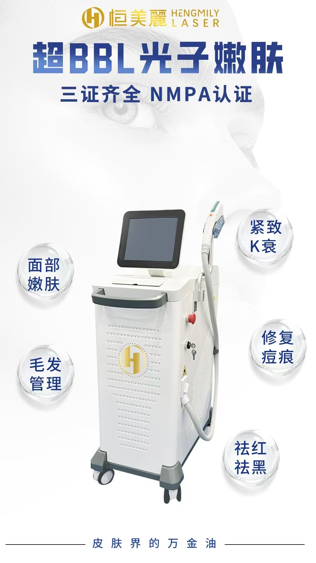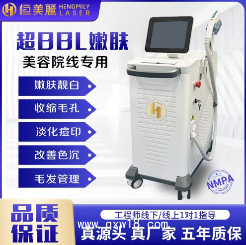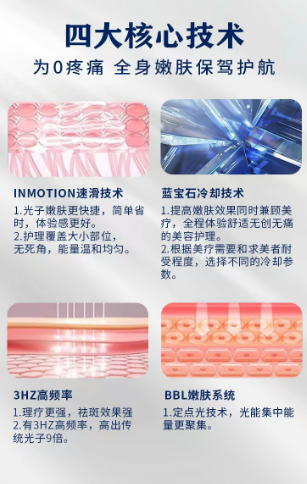 功能:選擇性吸收皮膚黑色素、血紅蛋白,在不損傷正常皮膚組織的前提下,達(dá)到祛黑、祛紅的目的。能夠恢復(fù)皮膚彈性,增強(qiáng)血管功能,改善皮膚松弛、淺表皺紋、毛孔粗大??梢悦撁㈧畎?、祛紅血絲、改善痤瘡、嫩膚。