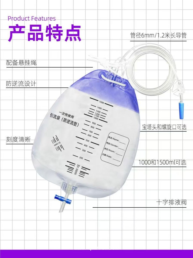 本產(chǎn)品為袋式的收集容器。普通型由袋體、連接管、吊耳、護帽、排液閥、連接頭、止流夾(選配)組成;防逆流型由袋體、連接管、吊耳、護帽、排液閥、連接頭、止流夾(選配)、防逆流膜組成。袋體、吊耳和連接管由聚乙烯材料制成;連接頭、護帽、止流夾和排液閥由聚丙烯材料制成,防逆流膜由PVC膜制成。通過體外管路與引流導(dǎo)管連接,形成密閉的引流系統(tǒng)。非無菌提供,一次性使用。