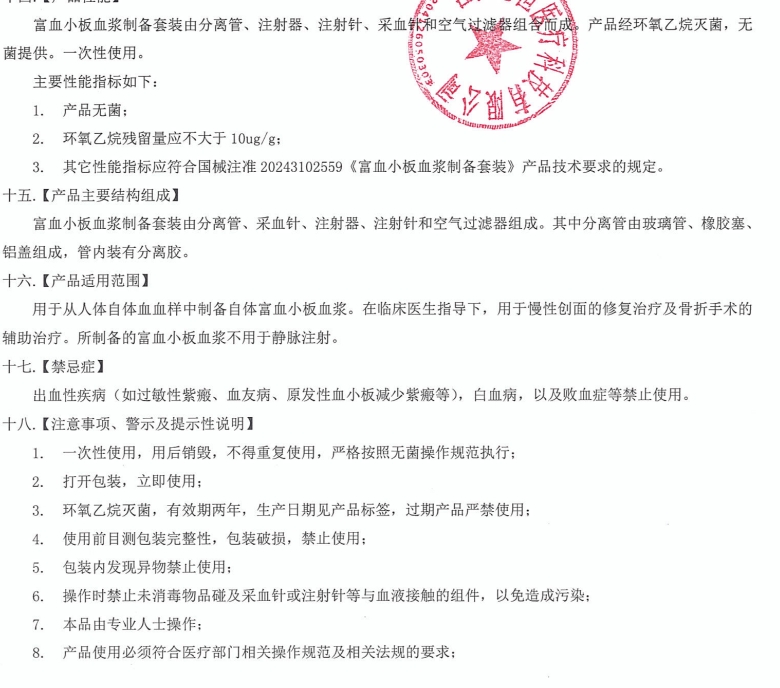 用于從人體自體血血樣中制備自體富血小板血漿。所制備的富血小板血漿不用于靜脈注射。